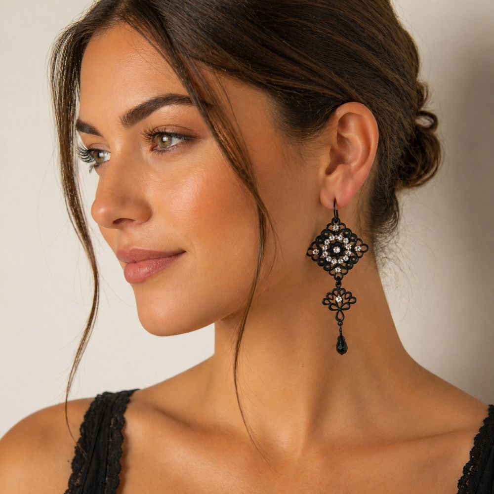Laissez-vous sĂ©duire par le charme intemporel de ces boucles dâoreilles IKITA au style dĂ©licatement baroque. Leur design travaillĂ© en filigrane noir met en valeur un jeu subtil de strass scintillants qui captent la lumiĂšre Ă chaque mouvement.