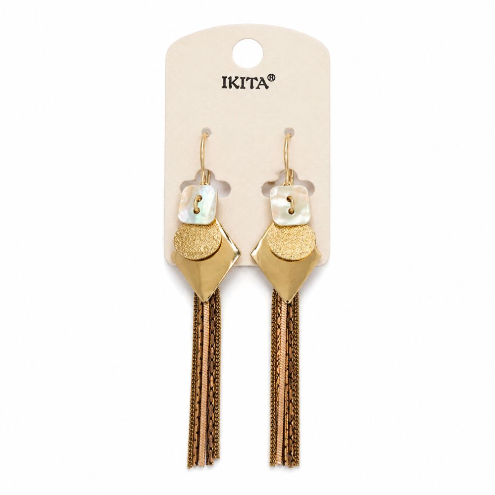 Laisse-toi séduire par l’élégance aérienne de ces boucles d’oreilles Ikita au design allongé et délicat. Leur composition harmonieuse associe une touche de nacre lumineuse à des éléments dorés aux finitions variées, créant un jeu subtil de textures et de reflets.