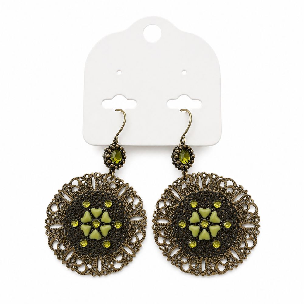 Boucles d’oreilles bohèmes au style vintage, avec détails filigrane et pierres vertes lumineuses.