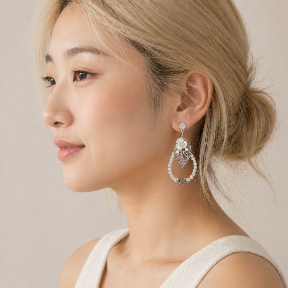 Boucles d’oreilles élégantes et lumineuses mêlant perles, feuille fine et détails floraux.