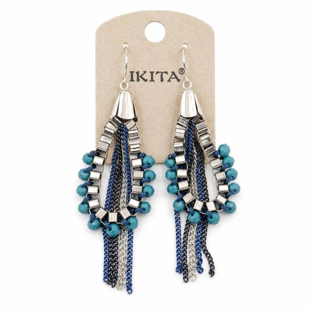 Boucles d’oreilles pendantes au design graphique avec chaînes et perles bleutées.