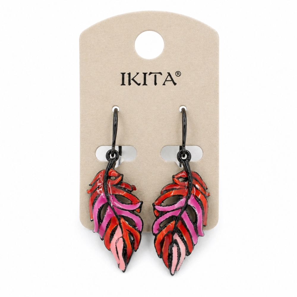 Boucles d’oreilles pendantes en forme de feuille aux couleurs rouges et rosées vibrantes.
