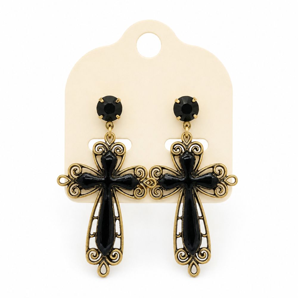 Boucles d’oreilles pendantes en forme de croix, au style chic noir et doré.
