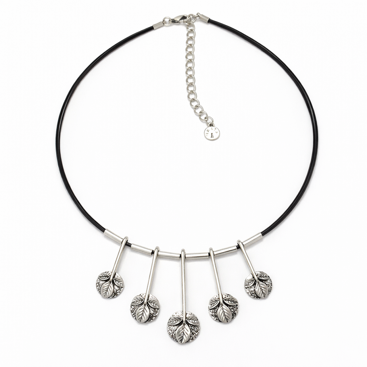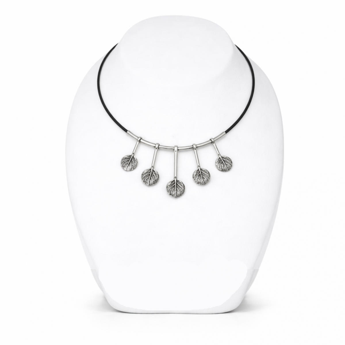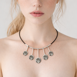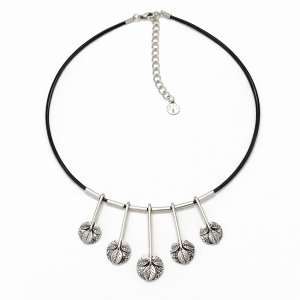 Craquez pour ce superbe collier Ikita au style à la fois moderne et inspiré de la nature. Monté sur un cordon noir élégant, ce bijou met en valeur cinq pendentifs argentés en forme de feuilles, finement travaillés pour apporter relief et brillance à votre tenue.