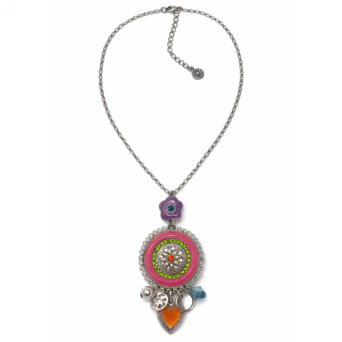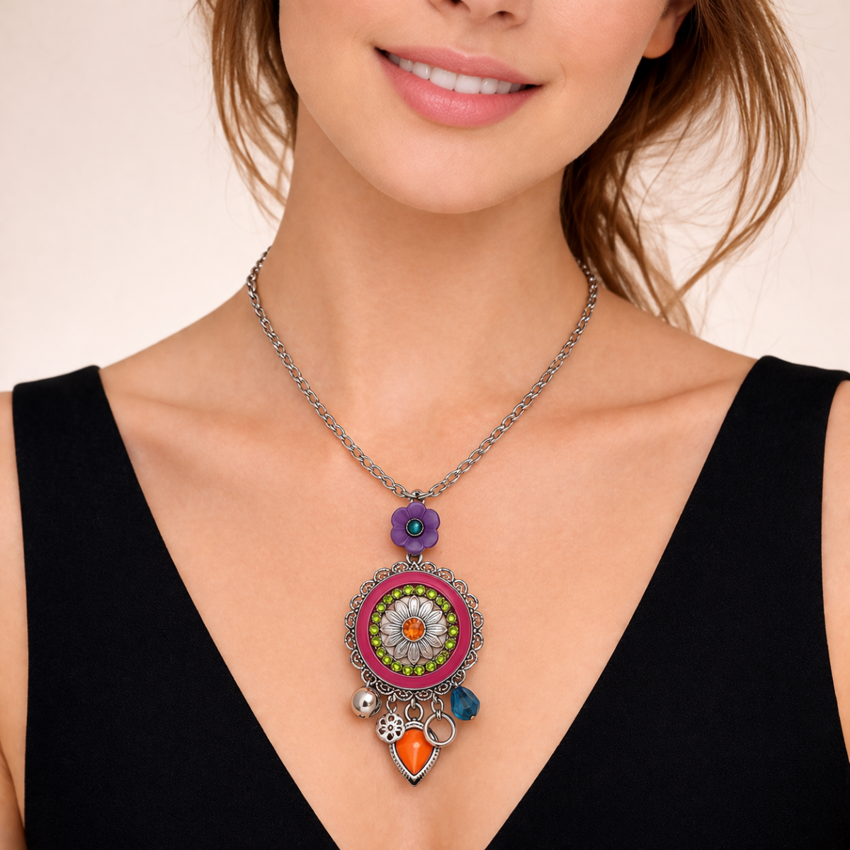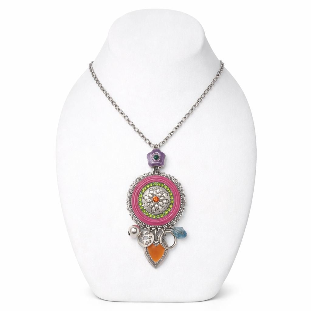Son médaillon central, richement décoré de motifs floraux et de pierres aux teintes vibrantes (violet, rose, vert et orange), est sublimé par de délicats charms suspendus qui apportent mouvement et éclat. Un bijou idéal pour illuminer un décolleté et affirmer votre style avec caractère.