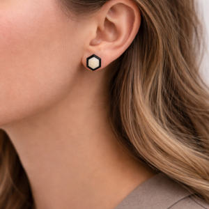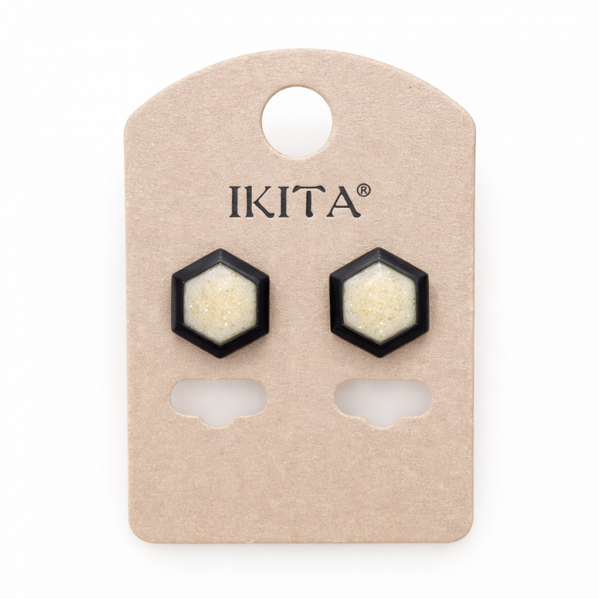 Optez pour un style discret et moderne avec ces boucles d’oreilles Ikita en forme hexagonale. Leur design géométrique associe un contour noir élégant à un centre crème pailleté, offrant de subtils reflets lumineux selon la lumière. Un bijou à la fois sobre et raffiné, parfait pour toutes les occasions.