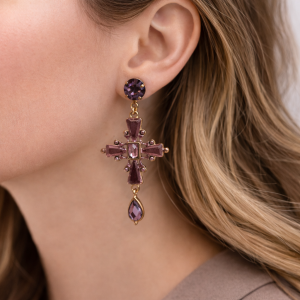 <h2>Boucles dâoreilles Ikita croix ornĂ©es rose violet pailletĂ© â 6 cm â Style baroque chic â Fermoir puce</h2>